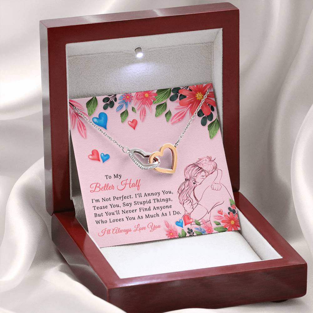 Two hearts embellished with Cubic Zirconia stones, interlocked together as a symbol of never-ending love. Made with high quality polished surgical steel. Cable chain measures 18 inches with a 4 inch extension, and fastens with a lobster clasp.