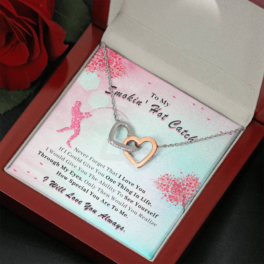 Two hearts embellished with Cubic Zirconia stones, interlocked together as a symbol of never-ending love. Made with high quality polished surgical steel. Cable chain measures 18 inches with a 4 inch extension, and fastens with a lobster clasp.