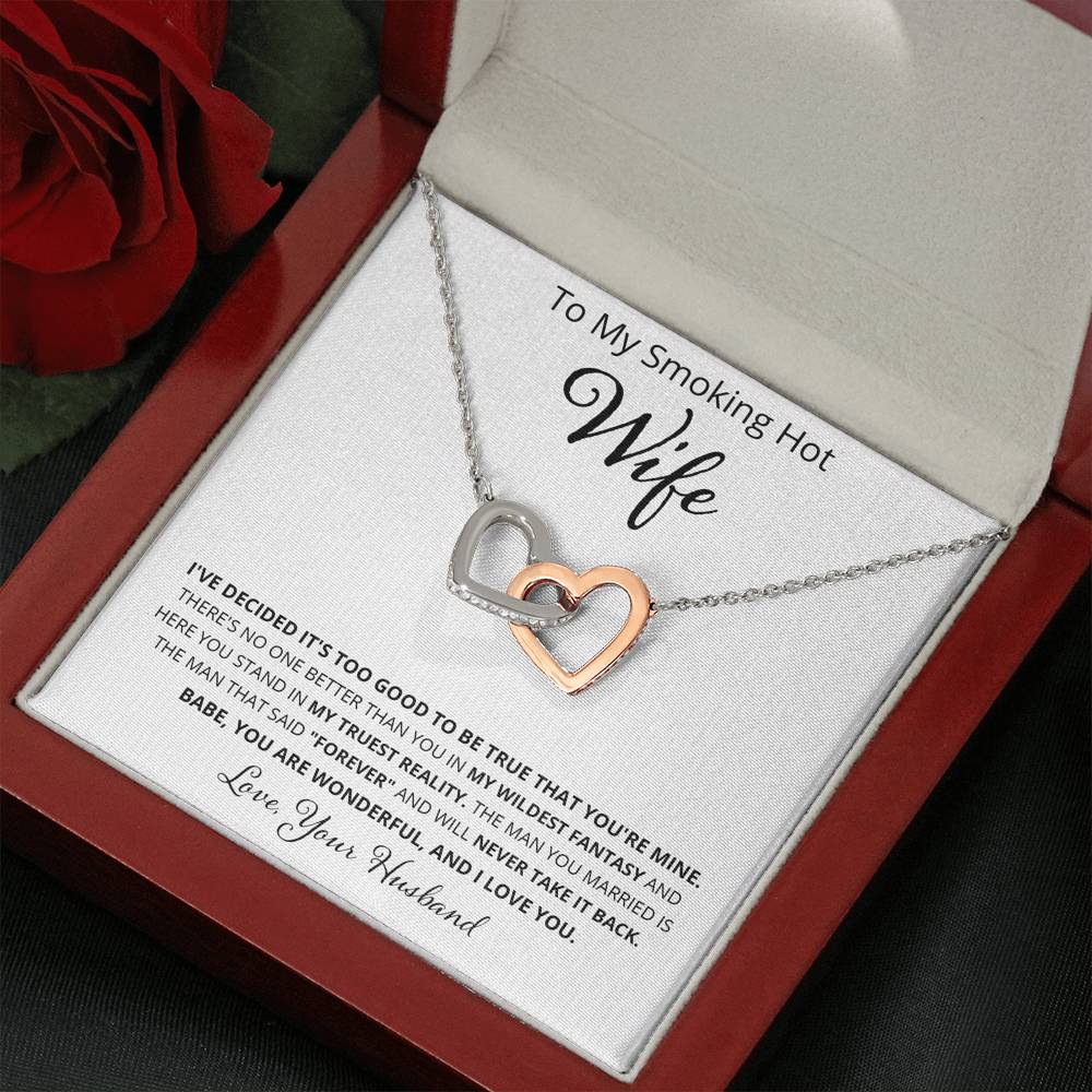 Two hearts embellished with Cubic Zirconia stones, interlocked together as a symbol of never-ending love. Made with high quality polished surgical steel. Cable chain measures 18 inches with a 4 inch extension, and fastens with a lobster clasp.