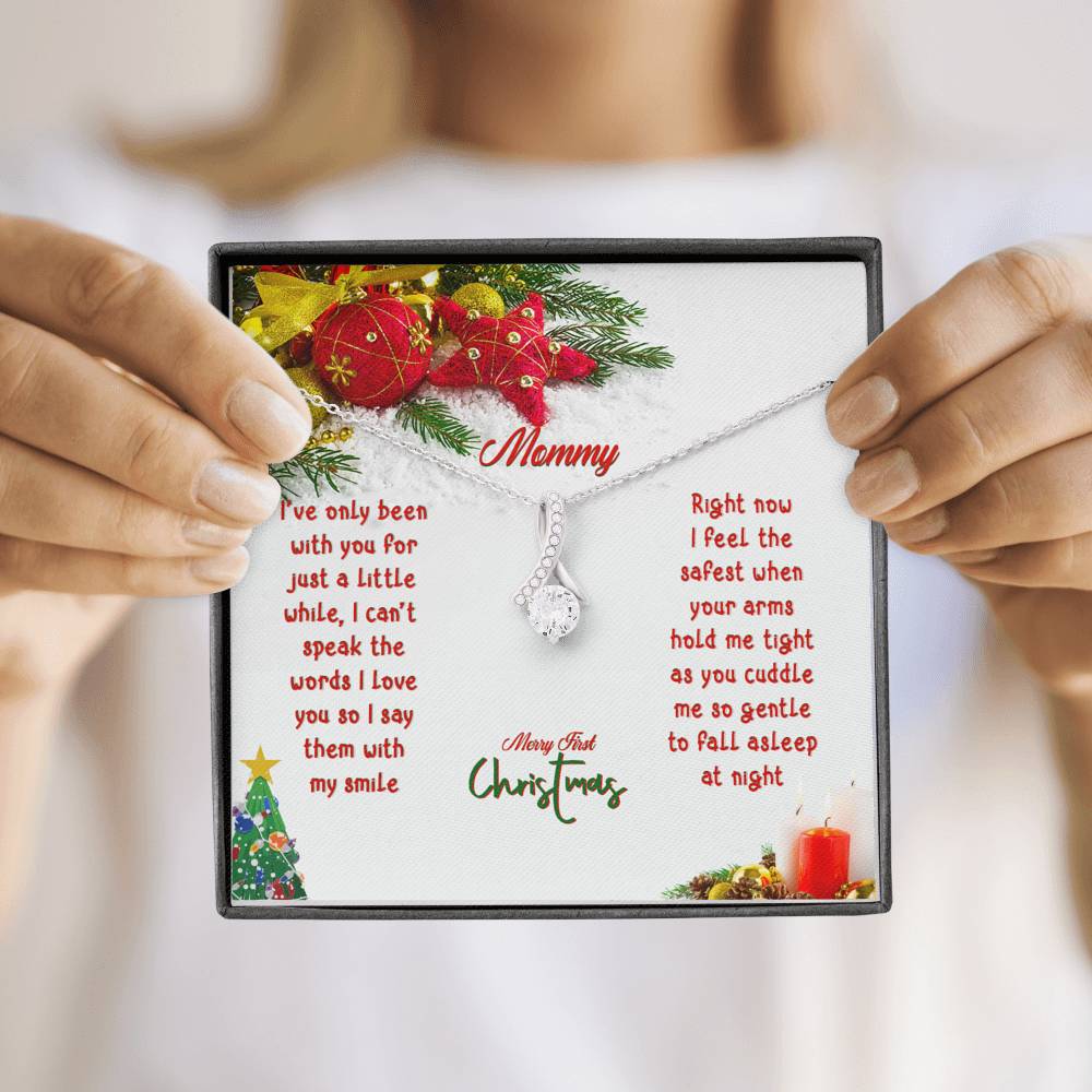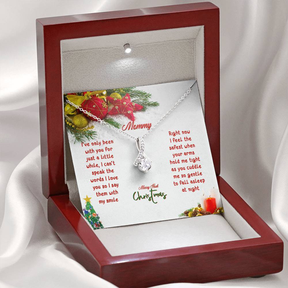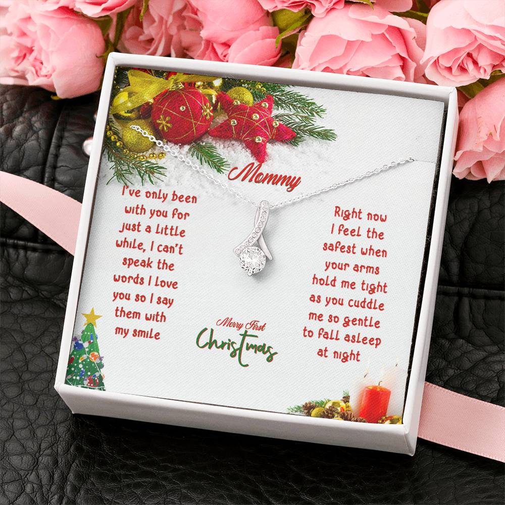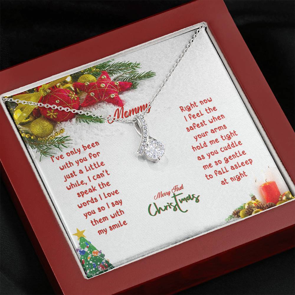 "I've only been with you for just a little while, I can't speak the words I love you so I say them with my smile. Right now I feel the safest when your arms hold me tight as you cuddle me so gentle to fall asleep at night. Merry First Christmas"