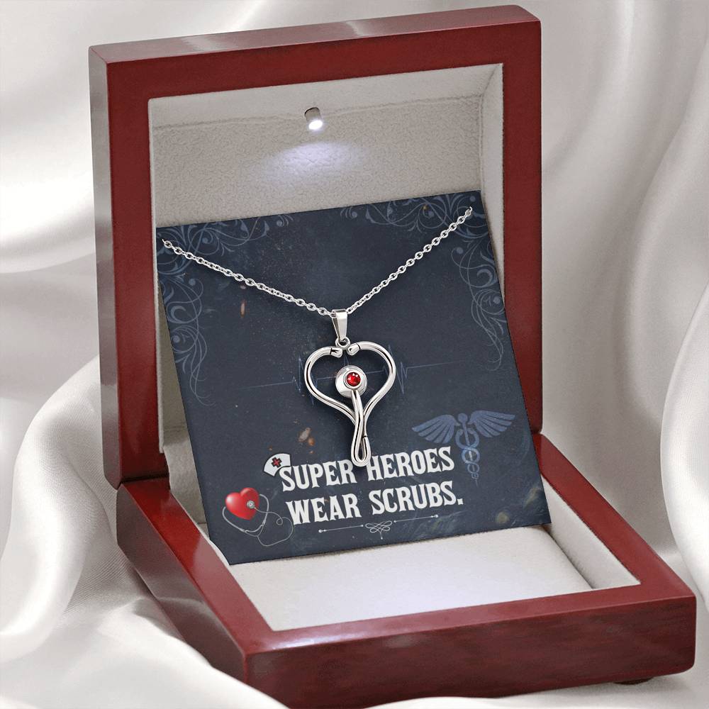 The heart shaped Stethoscope design is crafted from polished stainless steel and features a red Swarovski® Crystal at the center, symbolizing the love and care they provide day to day. Includes an adjustable cable chain that measures 18"-22" with a lobster clasp closure.